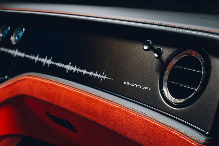 Ngoài ra, mặt táp-lô còn được khắc họa tiết hình sóng âm, đại diện cho âm thanh của khối động cơ W12 mà xe sử dụng. Bù lại, nội thất của Bentley Mulliner Batur được tạo ra từ những chất liệu sang trọng và hiếm hơn Continental GT. Khách hàng có thể chọn màu sắc và chất liệu nội thất theo ý muốn, bao gồm cả sợi tổng hợp tự nhiên, được miêu tả là trông giống sợi carbon nhưng bền vững hơn.
