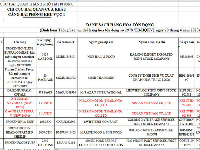 Trong số hàng tồn đọng ở cảng Tân Vũ, Hải Phòng có hàng chục ô tô mang thương hiệu Nissan mới 100%, được vận chuyển về từ cuối năm 2019 nhưng chưa có cá nhân, tổ chức nào làm thủ tục hải quan để nhập khẩu.