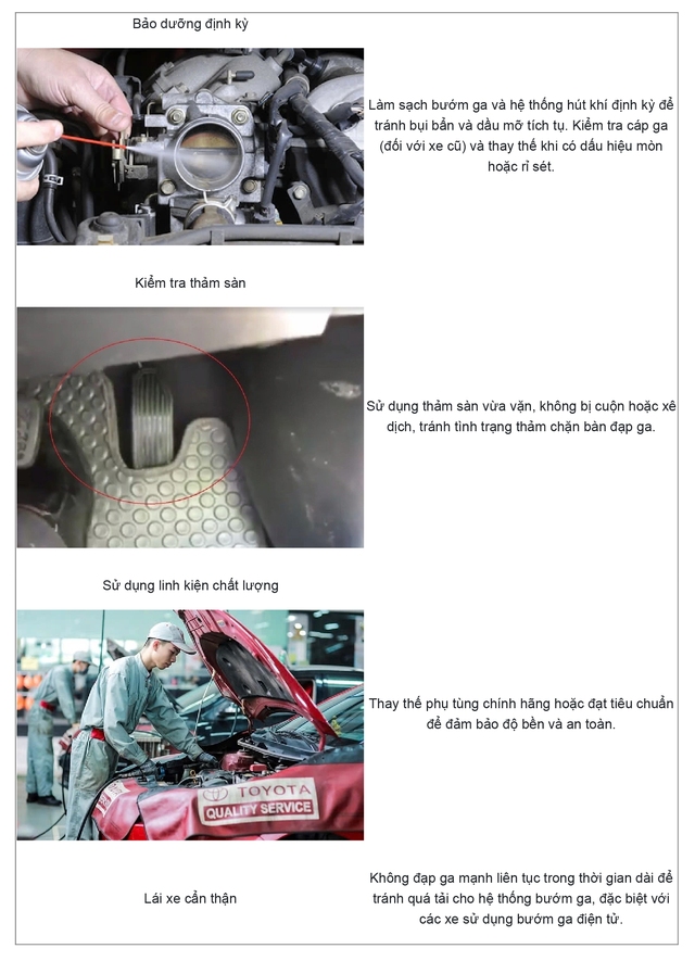 Sau khi dừng xe, kiểm tra nhanh xem có dị vật nào chặn bàn đạp ga hoặc ảnh hưởng đến hệ thống bướm ga. Nếu không xác định được nguyên nhân, gọi cứu hộ hoặc mang xe đến gara để kiểm tra.