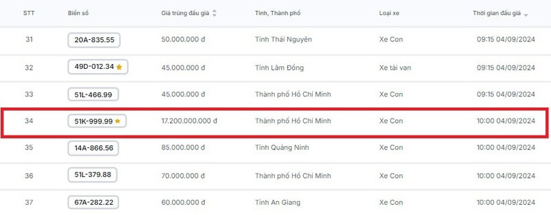 06/09/2024 05:59Biển vip 51K-999.99 chốt 17,2 tỷ sau 3 lần đấu giá