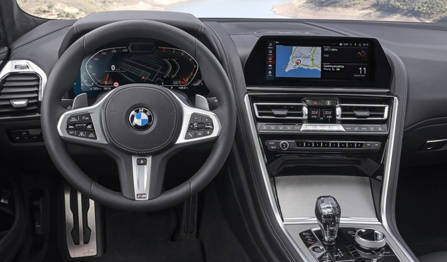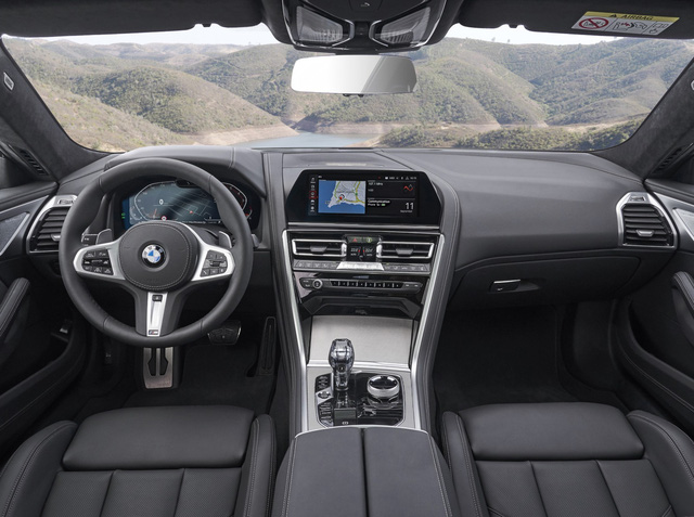 Nội thất 8-Series càng khẳng định dòng này tách biệt hoàn toàn với 7-Series. Thiết kế bảng điều khiển trước không giống trên bất cứ mẫu BMW nào. Khoang cabin bố trí chỉ 4 chỗ ngồi. Hàng ghế sau có 2 chỗ và được ngăn cách bằng điều hòa chính giữa. Cách thiết kế này gợi nhớ đến mẫu Porsche Panamera. Không chỉ ghế trước thể thao, hàng ghế sau cũng được thiết kế theo phong cách thể thao.