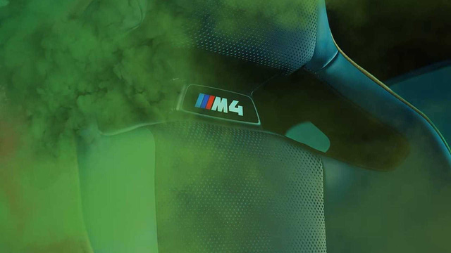 Một phần ghế ngồi trên M4 cũng lộ diện với phần logo phát sáng, chỉ khâu màu tương phản và lưng ghế hỗ trợ phần vai người dùng. Tựa đầu cố định cùng đai an toàn cũng có thể quan sát được phần nào.