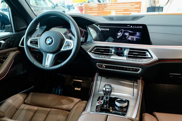Mang dòng máu BMW, nội thất X5 M Sport tạo nhiều cảm hứng cho người cầm lái với vô-lăng M bọc da, tích hợp lẫy chuyển số và các nút bấm chức năng. Cụm đồng hồ dạng màn hình điện tử kích 12,3 inch, kết hợp với tính năng hiển thị thông tin lên kính lái (HUD), cung cấp tối đa thông tin cho người ngồi sau vô-lăng. Phiên bản này sử dụng trần xe BMW Individual màu đen Anthracite.