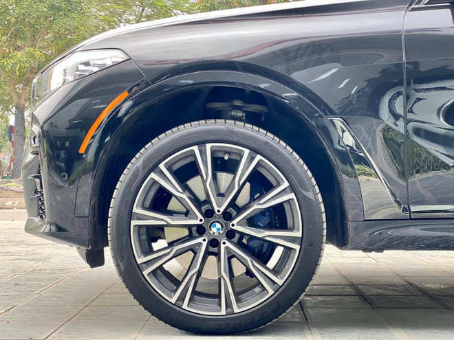 Đúng như tên gọi, chiếc BMW X7 được trang bị gói ngoại thất M Sport với cản trước và sau hầm hố, bộ vành 10 nan M kích thước 22 inch, phanh và hệ thống treo M. Là bản nhập Mỹ nên xe có thêm dải phản quang màu cam ở cản trước. Cụm đèn chiếu sáng là loại LED thích ứng.