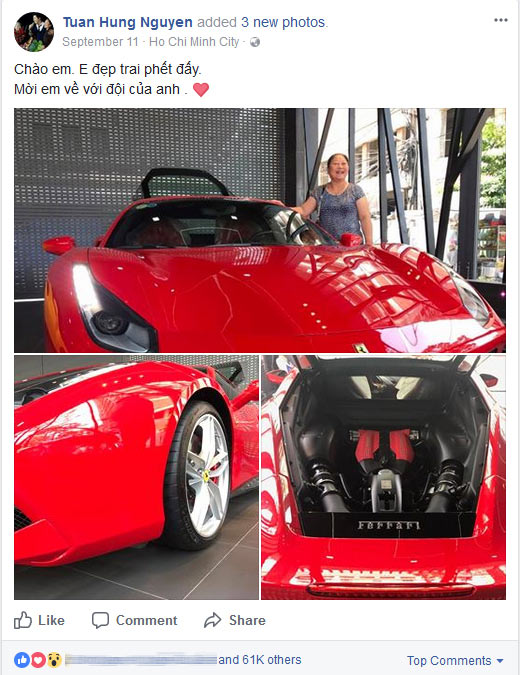 Ca sĩ sinh năm 1978 từng tiết lộ lý do mua siêu xe này là vì anh mang tuổi Ngựa, trùng với biểu tượng của hãng siêu xe Ferrari. Xe cũng sở hữu biển số rất đẹp 51F-889.88.