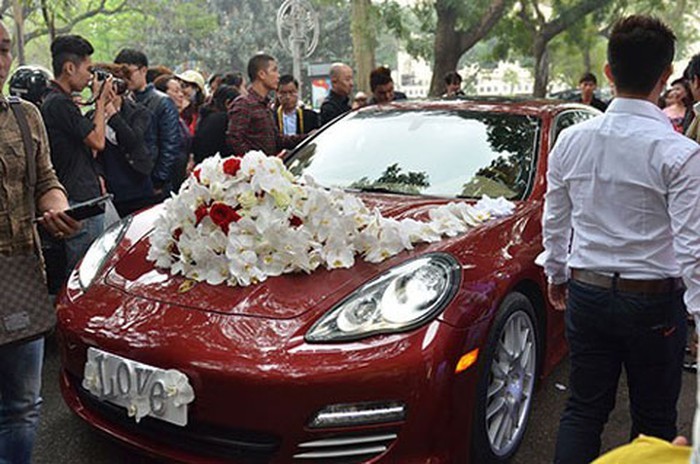 Siêu xe Porsche Panamera Turbo màu đỏ có giá gần 10 tỷ đồng được Tuấn Hưng sử dụng để đón dâu trong ngày cưới.