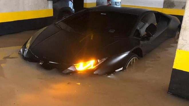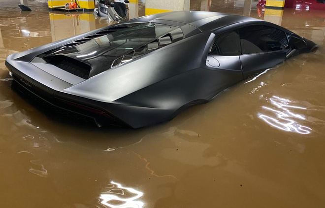 Hậu quả là hàng trăm ô tô đỗ ở đây bị nước lũ nhấn chìm, đáng chú ý trong số xe này có các mẫu xe đắt tiền của Range Rover, Porsche Panamera hay một chiếc siêu xe Lamborghini Huracan LP610-4 màu đen nhám - chiếc đang "nổi như cồn" trên mạng xã hội.