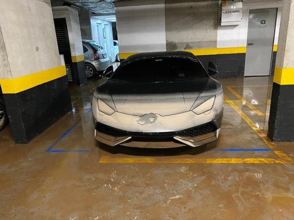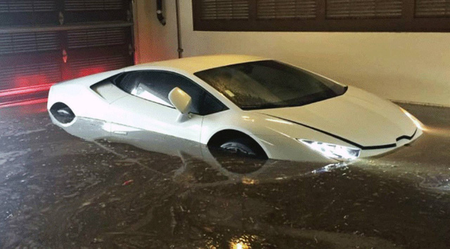 Lực lượng của ban quản lý toà nhà phải đợi hết mưa mới bắt đầu bơm nước ra. Do ngâm trong nước lâu nên siêu xe Lamborghini Huracan LP610-4 nhem nhuốc bùn đất, nước lũ tràn vào khoang lái và cả động cơ của xe gây thiệt hại nghiêm trọng.
