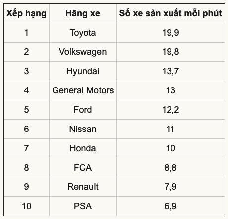 Phân tích dữ liệu toàn ngành, MoneyShake (Anh) cho thấy số lượng ôtô được hoàn thiện trong mỗi phút. Hãng xe Nhật dẫn đầu với 19,9 xe, ở ngay sau là Volkswagen với 19,8. Chiếm vị trí số 3 là Hyundai với 13,7 xe. Và phần còn lại là 7 hãng ôtô lớn trong ngành. Dưới đây là Top 10: