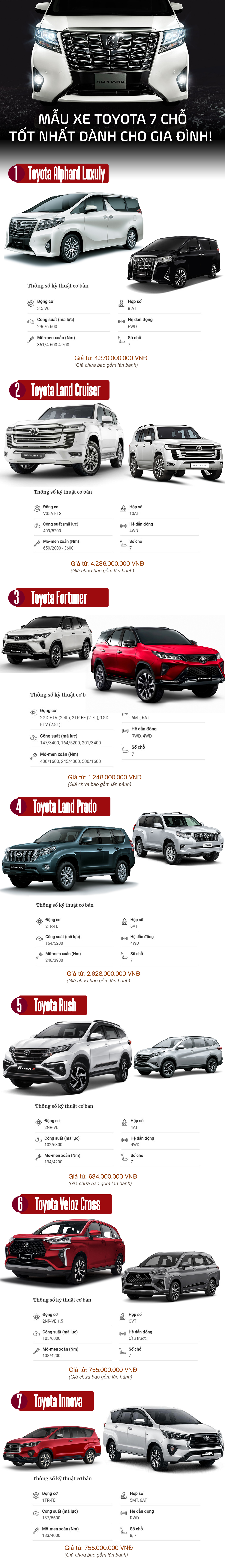 Xu hướng mua ô tô sử dụng cho gia đình đang được lựa chọn khá nhiều, cùng điểm qua các mẫu xe Toyota 7 chỗ có nội thất rộng rãi, đáp ứng được nhu cầu sử dụng.