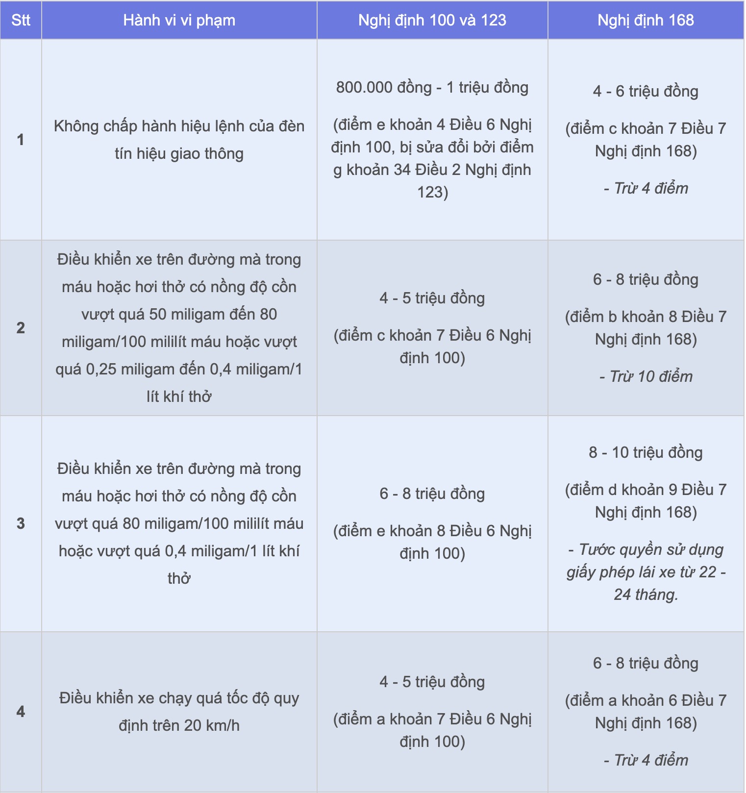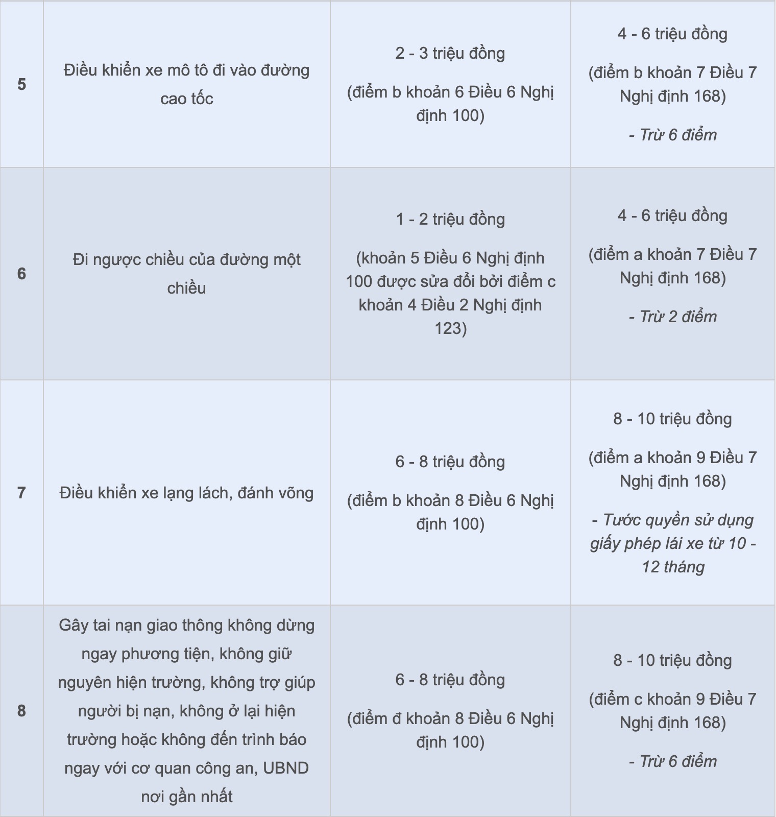 Các mức phạt này được quy định tại Điều 7, Nghị định 168 về xử phạt người điều khiển xe mô tô, xe gắn máy, các loại xe tương tự xe mô tô và các loại xe tương tự xe gắn máy vi phạm quy tắc giao thông đường bộ.