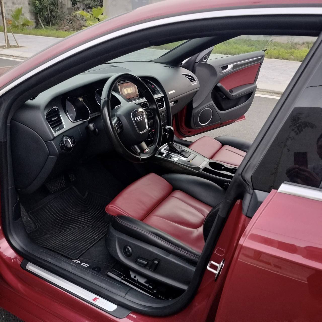 Bên trong nội thất, chiếc Audi S5 rao bán sử dụng hai tông màu đen/đỏ, với bố ghế thể thao ôm người ngồi. Bức ảnh chụp cho thấy da ghế vẫn ở mức chấp nhận được, đã xuất hiện những vết nhăn nhẹ nhưng đây là điều khó tránh khỏi. Đáng mừng là không thấy vết sờn, rách sau 80.000km lăn bánh. Tuy nhiên, chủ xe cho biết anh đã thay vô lăng sang loại của A5 thế hệ mới, nhưng bức ảnh chụp vẫn là vô lăng nguyên bản nên không loại trừ bức ảnh nội thất đã được chụp từ lâu.