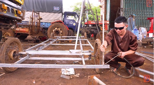 Phần khung sắt của xe được hàn nối với các loại ống kẽm kích thước nhỏ, trong khi các miếng bìa cát tông được gắn bằng keo nến. Tất cả các bộ phận như đèn xe, bánh xe hay lưới tản nhiệt cản trước đều được làm từ đồ phế liệu. Chẳng hạn như phần lốp xe được chế tạo lại từ hai bánh xe máy ghép lại, trong khi kính xe lại được làm từ phim X-quang và tấm nhựa meca.