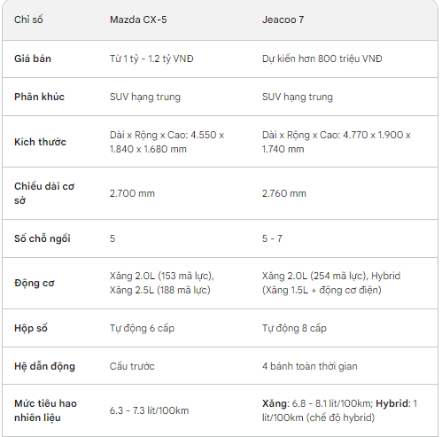 Hiện chưa rõ mức giá khởi điểm của mẫu xe này khi về Việt Nam, nhưng sẽ không quá ngạc nhiên nếu như nó được mở bán với giá từ khoảng trên dưới 800 triệu đồng. Được định vị trong phân khúc SUV cỡ C, Jaecoo J7 sẽ cạnh tranh trực tiếp với Honda CR-V, Mazda CX-5, Ford Territory, KIA Sportage hay Hyundai Tucson.