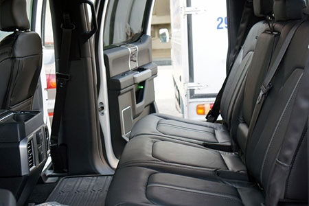 Hàng ghế phía sau rộng rãi cho 3 người ngồi. Vị trí để chân thoải mái. Toàn bộ nội thất của F-150 Platinum bọc da. |