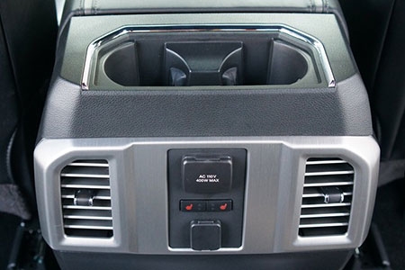 Hệ thống điều hoà riêng biệt cho hàng ghế sau. Ngoài ra, người ngồi phía sau cũng được cung cấp khay giữ cốc. F-150 Platinum có cổng sạc điện cho cả người ngồi phía trước và phía sau, điện áp 110 V, công suất 400 W. |