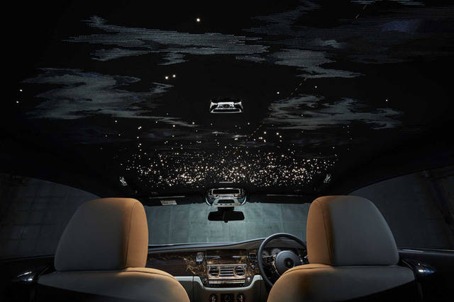Kiệt tác ‘bầu trời’ của chiếc Rolls-Royce Wraith Eagle VIII có tới gần 1200 sợi quang kết hợp cùng các cụm đường may gợi tưởng đám mây và các đường thêu chỉ màu đồng.