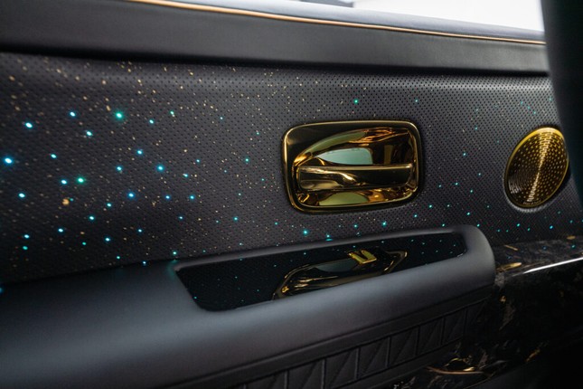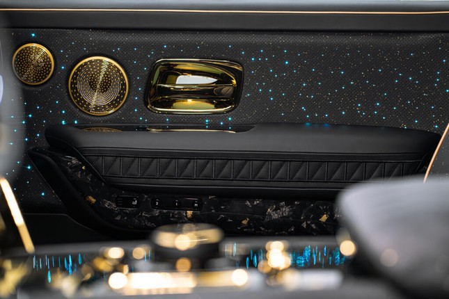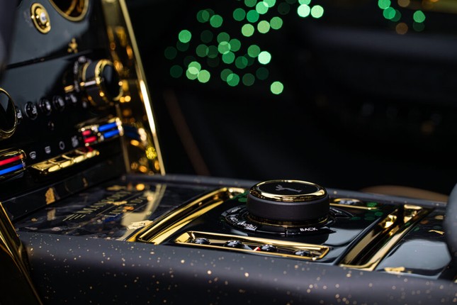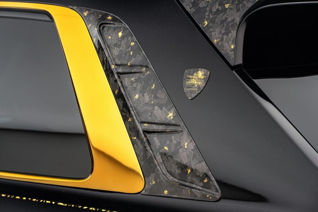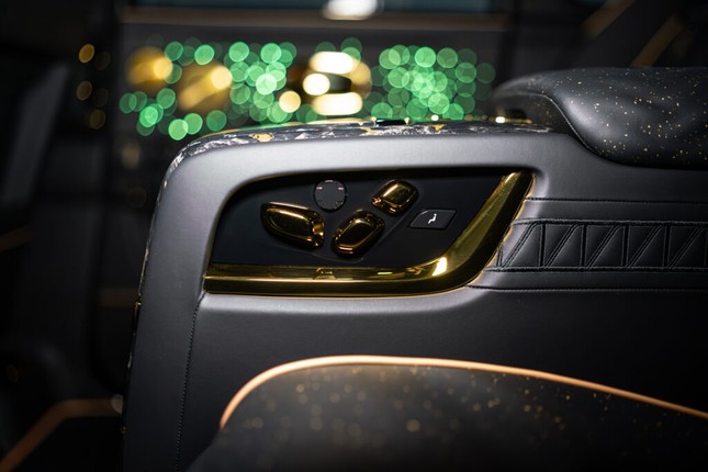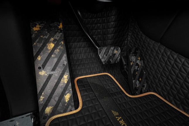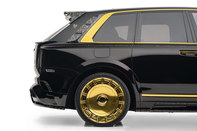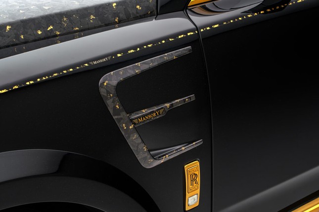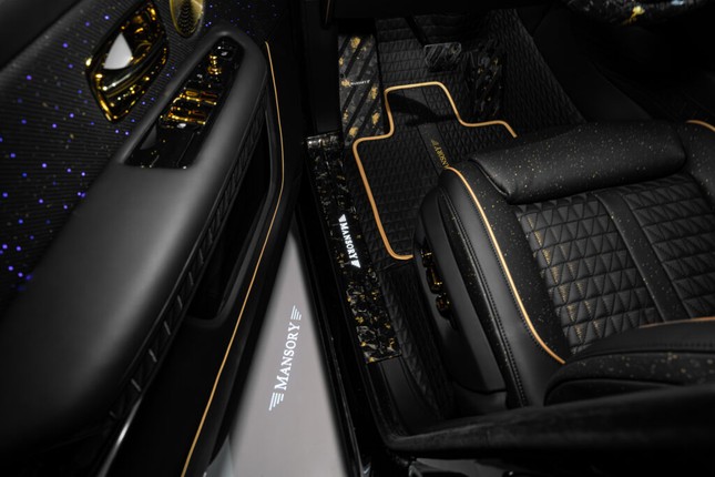 Đáng chú ý, đây không phải là sợi carbon thông thường. Mansory đã kết hợp các lớp dát vàng thật vào carbon. Lưới tản nhiệt phía trước, đường viền cửa sổ và tay nắm cửa cũng được dát vàng. Ngoài ra, bộ la-zăng 24 inch đồ sộ cũng được mạ vàng trông cực kỳ sang trọng và nổi bật.