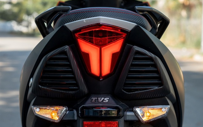 Điểm tiếp theo có thể nói tới là hai lỗ thông gió đặt cạnh đèn hậu. Chi tiết này gợi tới kiểu thiết kế gia tăng tính khí động học trên nhiều mẫu xe hiệu suất cao; tuy nhiên, chi tiết này trên TVS Ntorq nhiều khả năng nhằm nâng cao tính thẩm mỹ của xe.