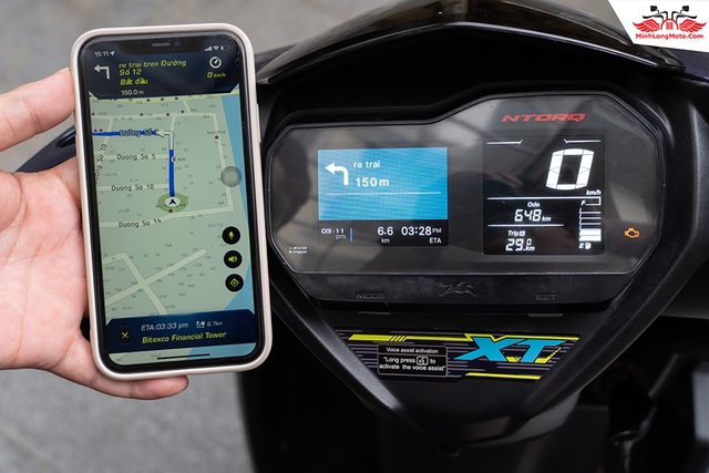 Một tính năng đáng nhắc tới là TVS Ntorq có thể kết nối với điện thoại qua Bluetooth; khi bật bản đồ, màn hình của xe có thể đưa ra chỉ dẫn.