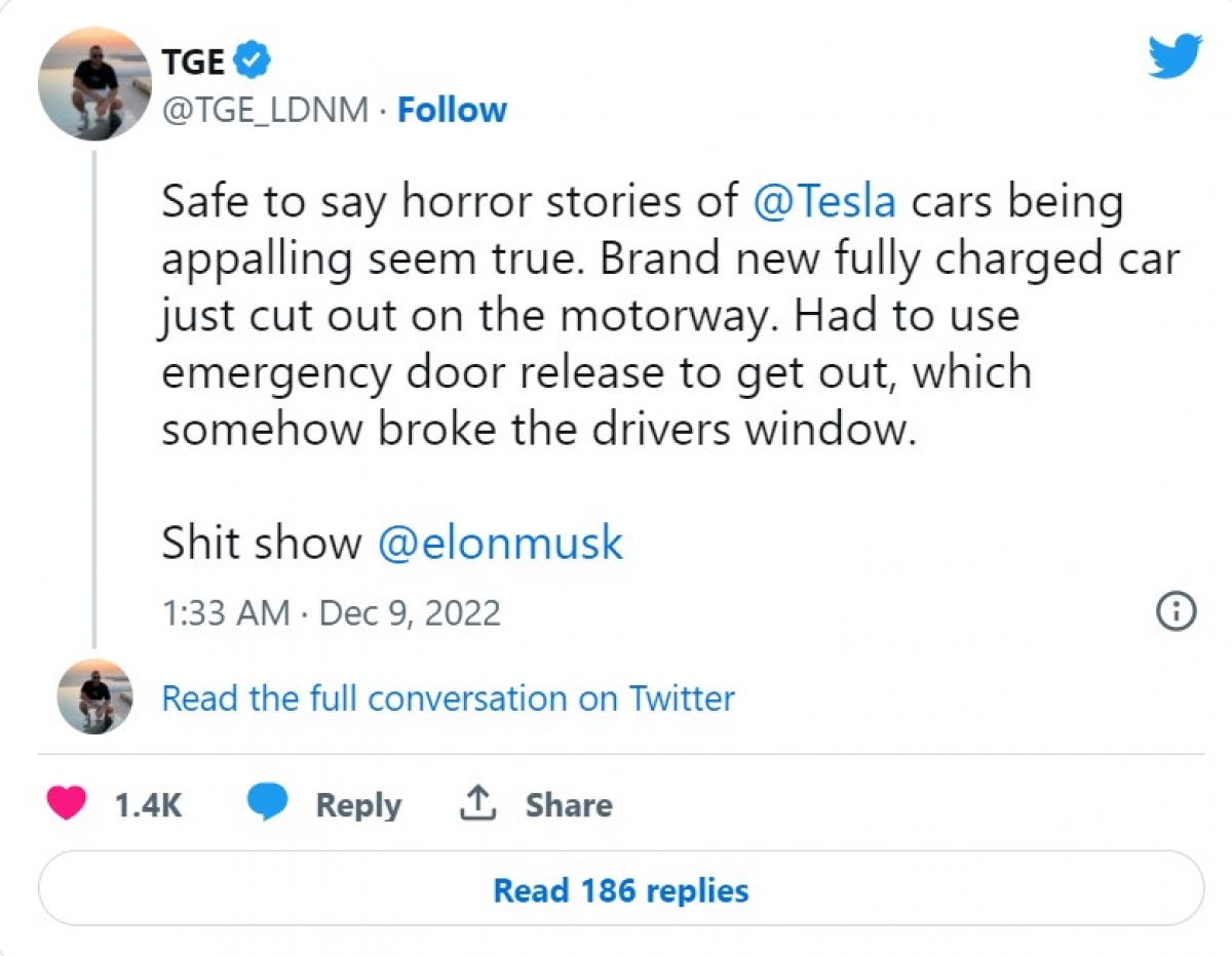 Exton đăng trên Twitter rằng, việc sử dụng cơ chế mở cửa khẩn cấp của Tesla “bằng cách nào đó đã làm hỏng cửa sổ bên phía người lái”. Cánh cửa “dị thường” của hãng xe đã từng đẩy các tài xế vào những tình huống còn tồi tệ hơn. Trong một trường hợp khác, người dùng ở Canada chia sẻ Exton rằng, đã phải phá vỡ cửa sổ ô tô để thoát khỏi một chiếc Model Y đang bốc cháy.