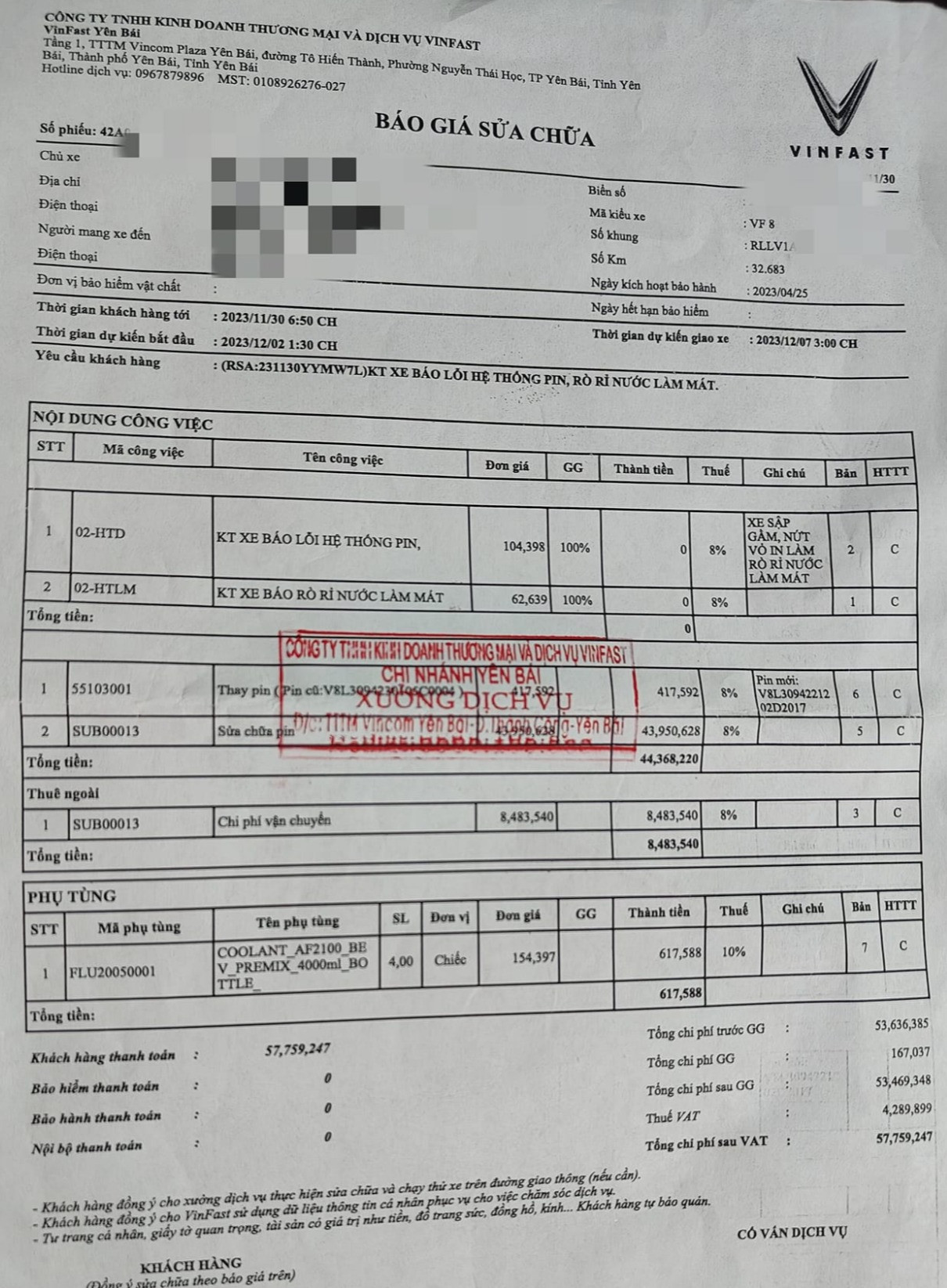 Sau khi được kiểm tra tại xưởng dịch vụ, kỹ thuật viên cho biết bộ khung vỏ bảo vệ pin đã bị nứt và làm rò rỉ nước làm mát, nguyên nhân được cho là do tác động mạnh từ bên ngoài. Tổng chi phí được xưởng dịch vụ thông báo lên tới gần 60 triệu đồng. Trong đó, chi phí thay một số linh kiện, bộ phận của hệ thống pin và khung vỏ pin là 47,9 triệu đồng, chi phí vận chuyển pin từ nhà máy ở Hải Phòng lên Yên Bái là 9,8 triệu đồng.