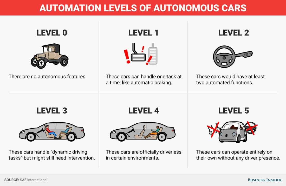 Cấp độ 5: Xe có thể tự xử lý tất cả các tình huống, kể cả trong điều kiện thời tiết xấu như mưa, tuyết. Đây là kịch bản lý tưởng, bạn chỉ cần nhập vị trí những nơi cần đến và chiếc xe tự thực hiện tất cả. Ví dụ xe sẽ đưa các con bạn tới trường học rồi quay lại để đón bạn đi làm.