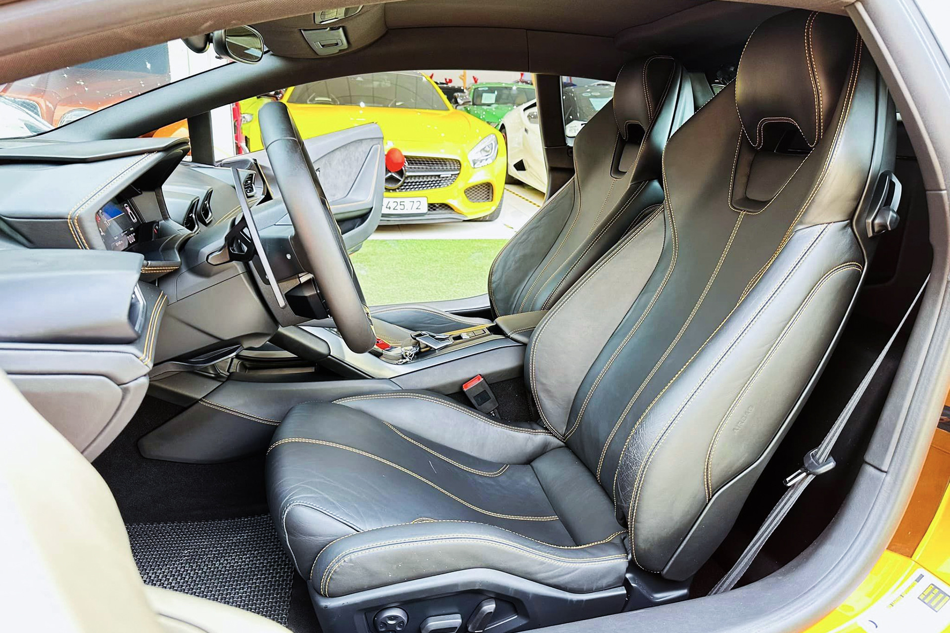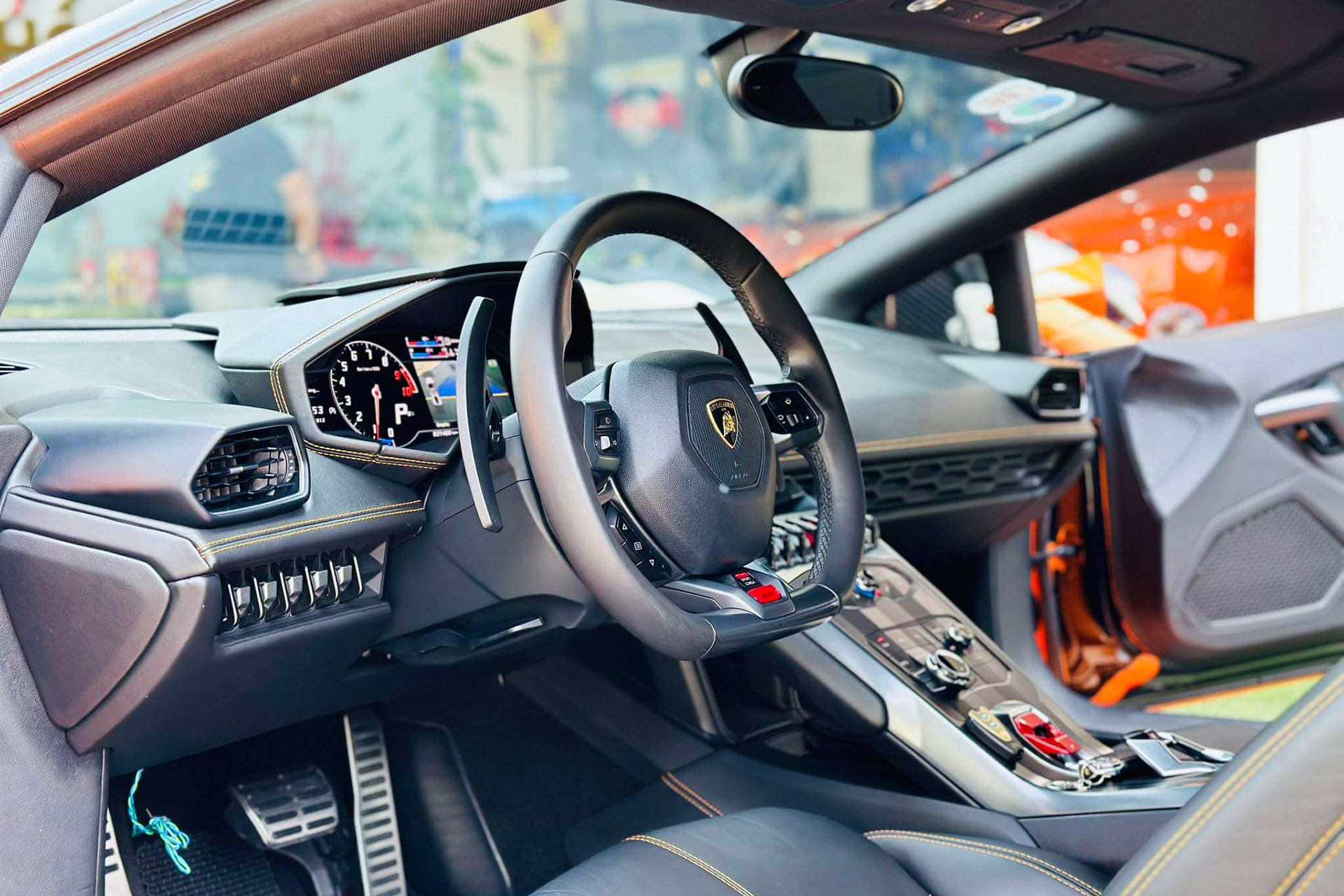 Sau 10 năm sử dụng, khoang nội thất chiếc Lamborghini Huracan còn khá mới, dù ghế da đã xuất hiện vết nhăn. Tông màu đen chủ đạo được điểm xuyết bằng đường viền và đường chỉ khâu màu cam như nguyên bản. Trang bị trong xe khá đơn sơ khi không có các chi tiết ốp sợi carbon hay màn hình trung tâm như dòng Lamborghini Evo hay Tecnica.