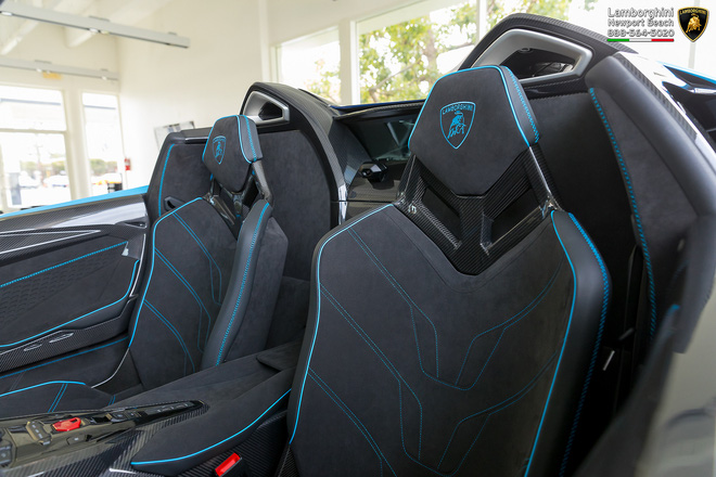 Bên trong nội thất, chiếc Lamborghini Centenario Roadster LP770-4 này sử dụng chất liệu Alcantara có tông màu đen chủ đạo, điểm xuyết là màu xanh dương cho họa tiết ở ghế ngồi, đường chỉ khâu, tay nắm cửa,... Ghế ngồi là dạng ghế đua làm từ sợi carbon.