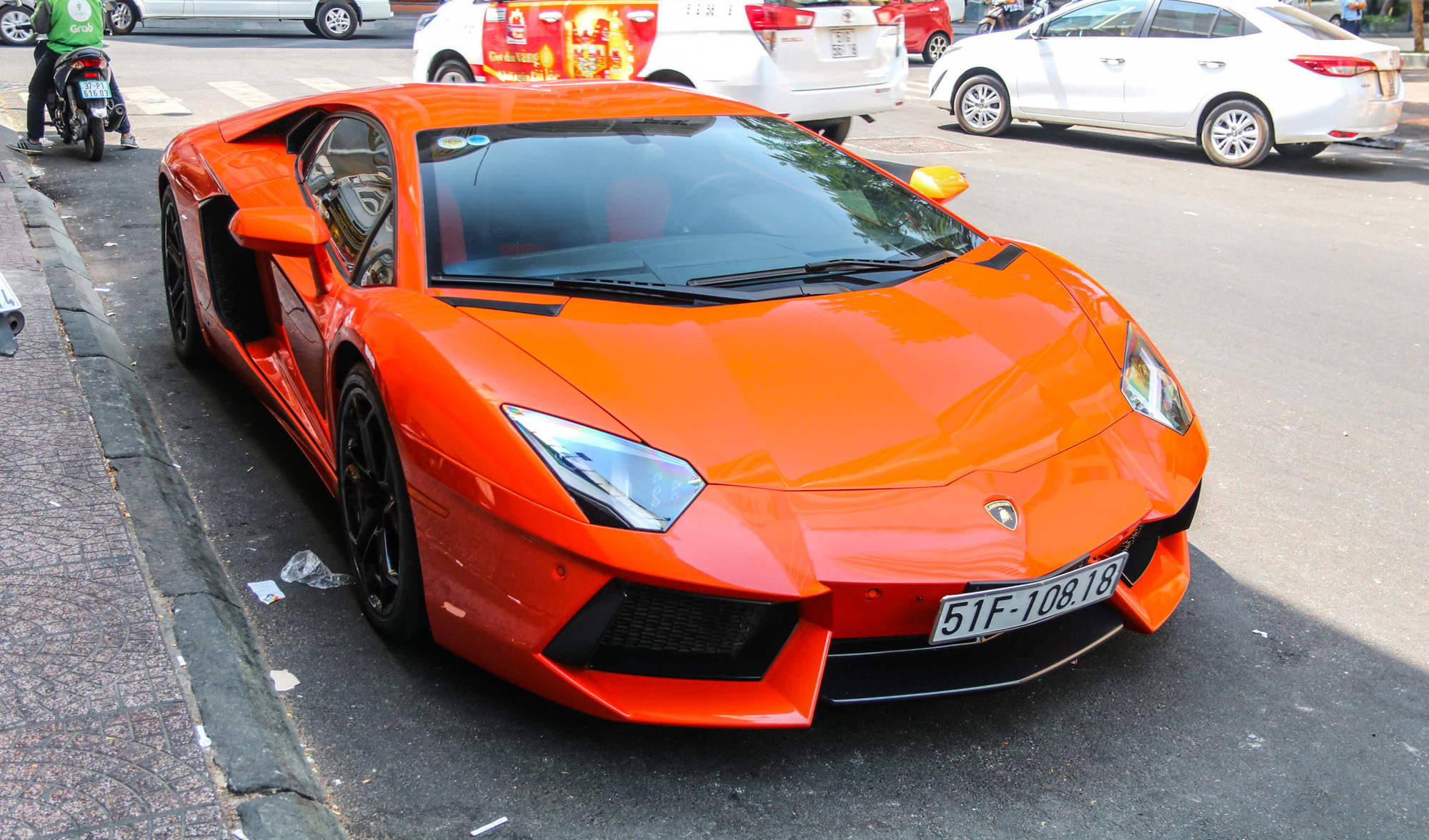 Siêu xe Lamborghini Aventador LP700-4 màu cam của đại gia Minh nhựa là một trong hai siêu xe Aventador ở Việt Nam về nước hồi tháng 6/2012.