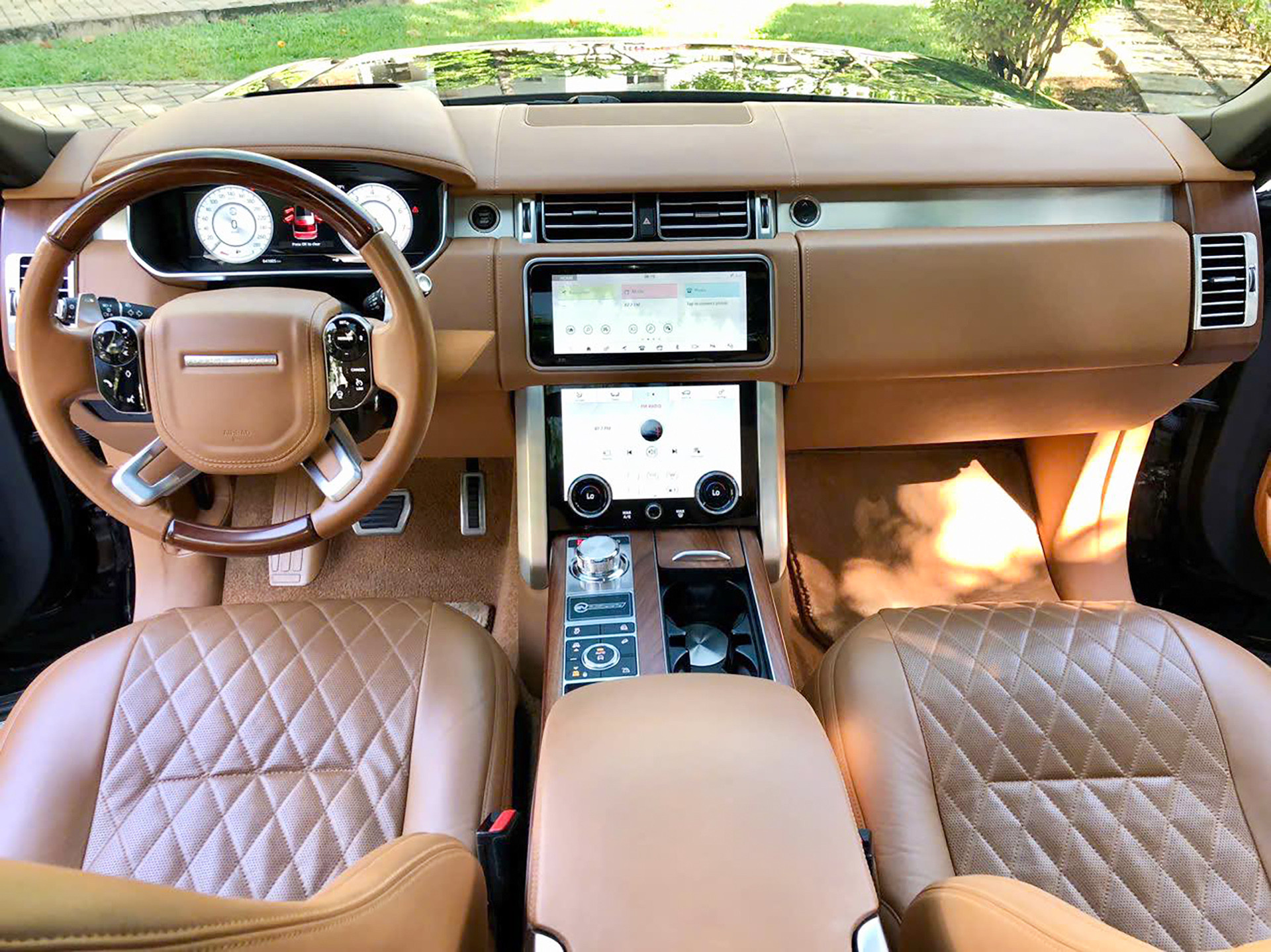 Nội thất chiếc Range Rover SVAutobiography dùng tông màu nâu chủ đạo, trang trí bằng các chi tiết gỗ tự nhiên màu nâu trên vô-lăng, bảng điều khiển trung tâm, táp-lô, táp-pi cửa,… Tuy ít sử dụng nhưng ghế ngồi đã xuất hiện một số vết nhăn, song không đáng kể. Tổng thể mọi thứ đều còn rất mới.