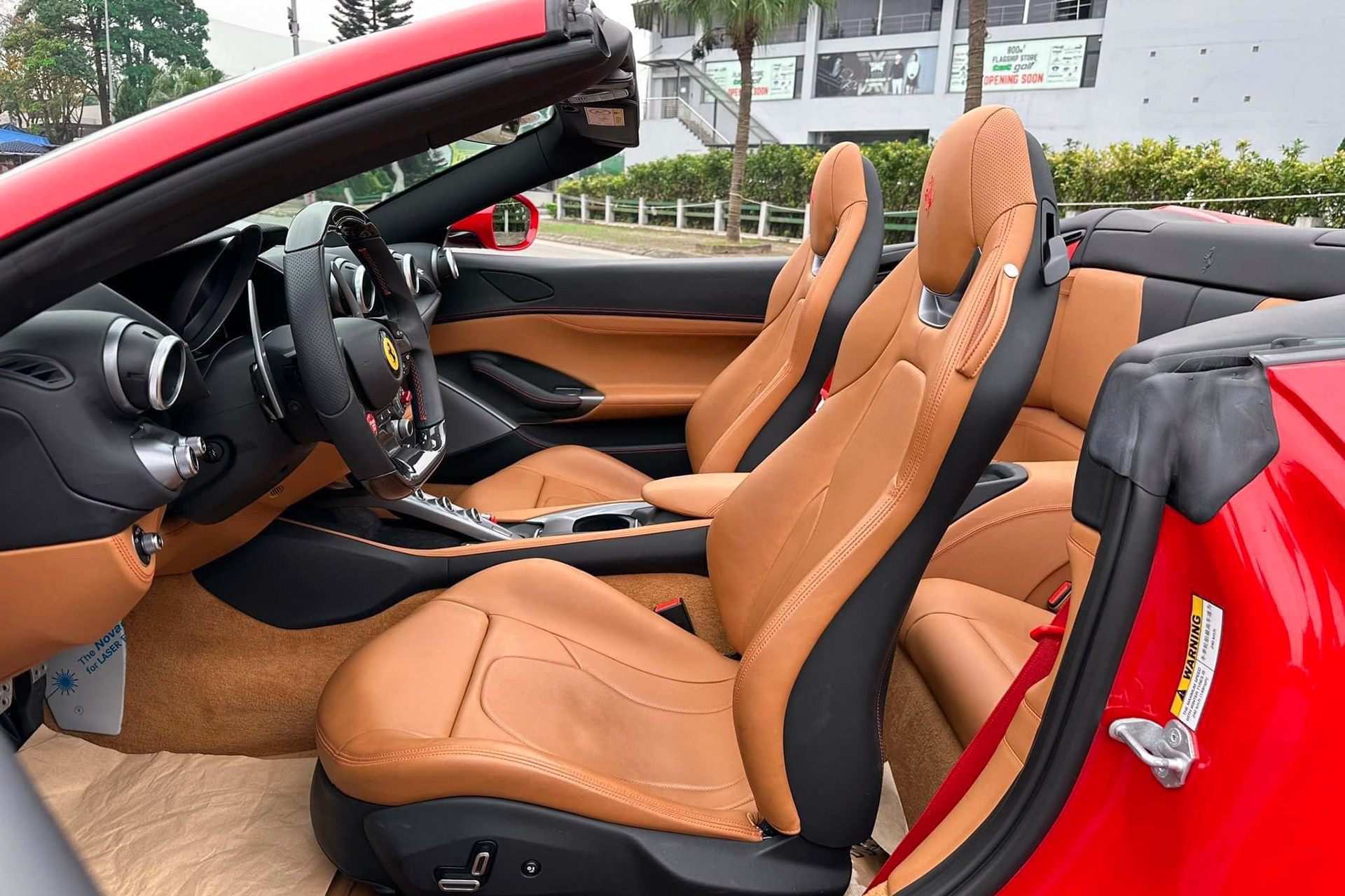 Ngoài ra, nội thất chiếc Ferrari Portofino M này bọc da tông màu nâu chủ đạo, kết hợp cùng màu đen và điểm xuyết bằng đường chỉ khâu màu đỏ. Trong khi đó, chiếc còn lại bọc da màu đen chủ đạo. Khoang lái của xe chỉ có duy nhất vô-lăng dùng chất liệu carbon. Chính giữa là màn hình giải trí 10,2 inch tích hợp Apple CarPlay.
