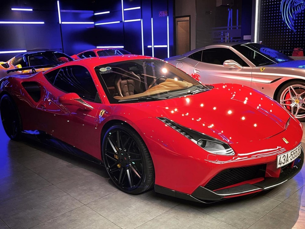 Chiếc xe Ferrari 488 GTB đeo biển 43A-555.55 có ngoại hình màu sơn đỏ Rosso Corsa truyền thống đi kèm nhiều chi tiết bằng carbon trong gói độ của hãng Novitec Rosso như cản va trước, nẹp trên gương chiếu hậu, nẹp sườn, thanh chia gió...