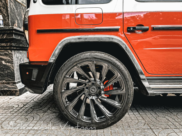 Không những thế, bộ mâm nguyên bản của chiếc G 63 này cũng được thay thế sang loại có tên Urban UV-3 với kích thước 23 inch, sơn đen. Bộ vành này được tạo ra bởi sự kết hợp giữa hãng độ Urban và hãng chuyên sản xuất mâm Vossen, giá bán của chi tiết này là khoảng gần 178 triệu đồng.