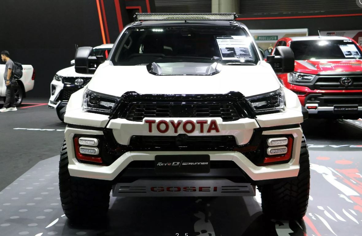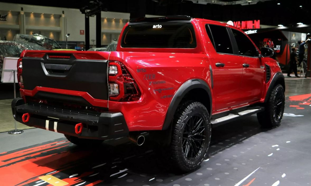 Chiếc Toyota Hilux Revo với màu sơn đỏ nổi bật đến từ một hãng độ có tên Arto. Ngoại hình xe được lấy cảm hứng từ Ford Ranger Raptor.