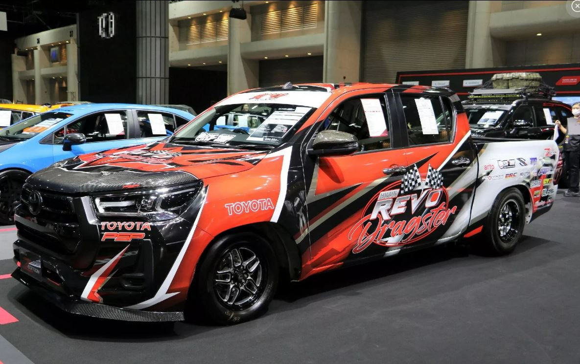 Nổi bật nhất về ngoại thất là chiếc Hilux Revo Dragster màu sơn sặc sỡ, bánh xe đường kính nhỏ, các bộ phận làm bằng sợi carbon (bộ chia khuếch tán gió phía trước, cửa sau và chụp gương), ghế đua...