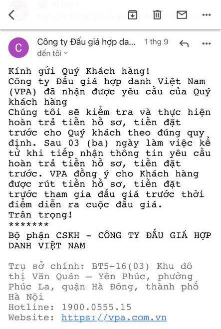 Trên thực tế, theo tìm hiểu của VietNamNet, trước đó khi nhiều khách hàng đồng loạt yêu cầu rút tiền cọc sau phiên đấu giá ngày 22/8 không thành công vì trang web của VPA bị lỗi , công ty đã có phản hồi về việc hoàn cọc.