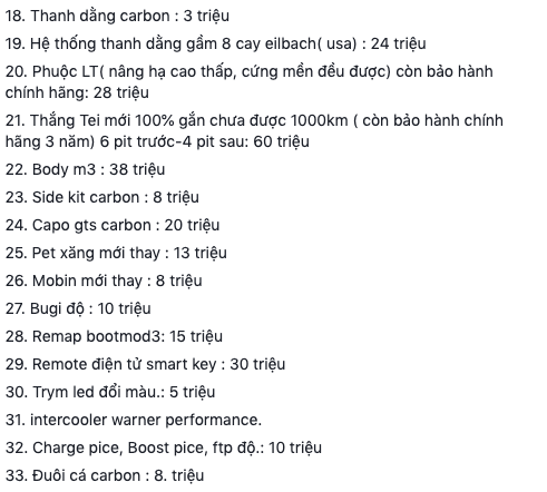 Chiếc xe xuất hiện trên rất nhiều diễn đàn xe cũ với bảng giới thiệu chi tiết từng bộ phận nâng cấp, đi kèm giá cụ thể. Bảng danh sách này có tới 33 đầu mục tương ứng với 33 chi tiết đã được thay thế/nâng cấp trên chiếc xe 3 năm tuổi. Tạm bỏ qua những thay đổi nhỏ khác mà chính chủ nhân cũng không thể kể hết, số tiền mà dân chơi Sài Gòn đã phải bỏ ra cho chiếc BMW 320i 2015 lên tới khoảng 900 triệu đồng.