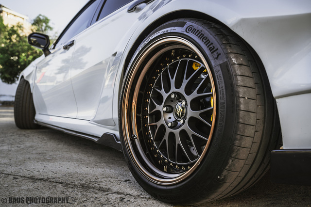 Không chỉ 4 vòm bánh xe, phần lưới tản nhiệt ở phía trước cũng được thay đổi thiết kế nhằm tăng tính thể thao cho phần đầu xe. Ở bên hông, dân chơi Tây Ninh cũng loại bỏ bộ mâm nguyên bản để thay thế thành loại đa chấu tối màu của Nhật Bản, ẩn bên dưới là cùm phanh màu vàng của Brembo.