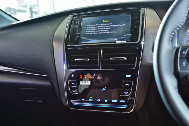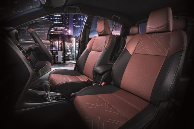 Bên trong khoang cabin rộng rãi, thoải mái với tông màu chủ đạo là đỏ và đen huyền bí cùng các họa tiết chữ X lạ mắt trên lưng ghế và đệm khiến Yaris trở nên sang trọng hơn.
