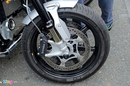 R Nine T được gắn đĩa kép đường kính 320 mm trước, 265 mm ở phía sau, kết hợp với kẹp phanh Brembo. Hệ thống ABS là tiêu chuẩn trên xe. Chiếc xe này được một người chơi trang bị bộ vành bằng sợi carbon như trên siêu xe. |