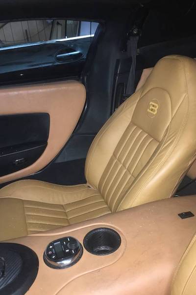Bên trong nội thất xe còn tồi tệ hơn khi phần ghế da màu sữa đã ngã màu với nhiều vết bẩn loang lỗ. Đặc biệt trong khi siêu phẩm Bugatti Veyron thật không có hàng ghế thứ 2 thì chiếc xe này vẫn giữ nguyên hàng ghế nguyên bản.