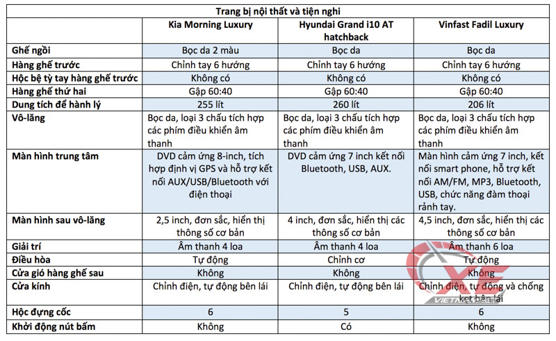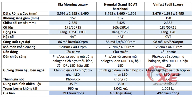 Dưới đây là so sánh 3 phiên bản cao cấp nhất của 3 mẫu lắp ráp trong nước gồm Kia Moring Luxury (giá niêm yết 393 triệu đồng), Hyundai Grand i10 với bản 5 cửa 1.25L AT (giá niêm yết 405 triệu đồng và Vinfast Fadil Luxury (giá niêm yết 492 triệu đồng).