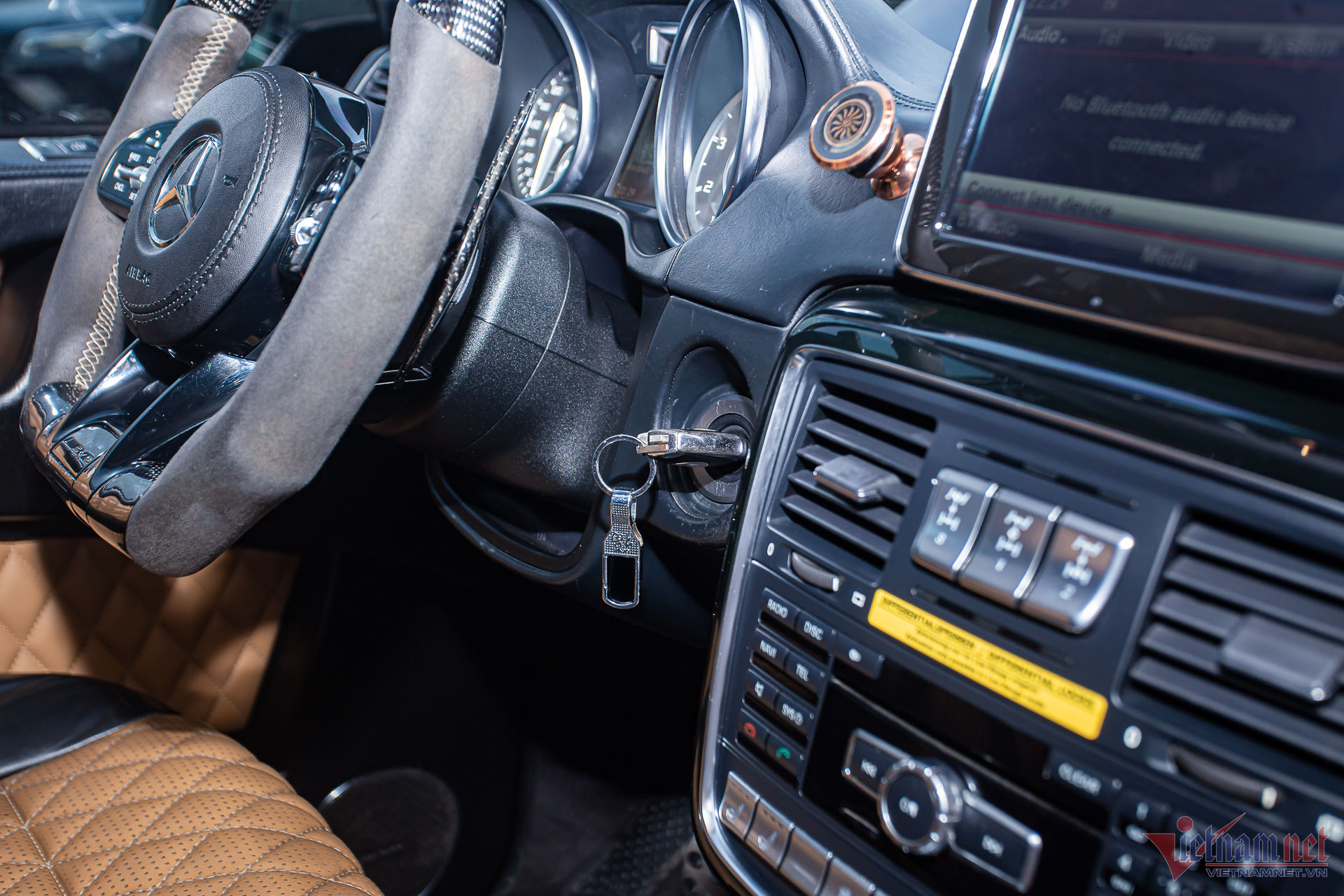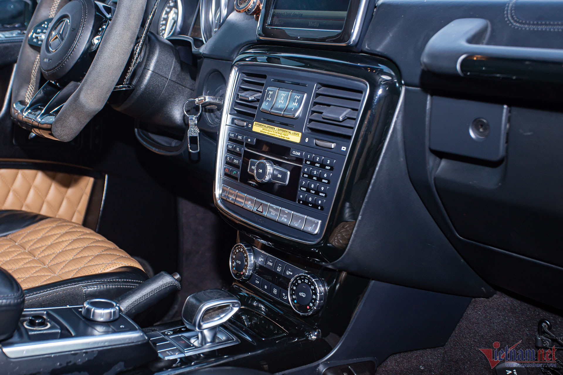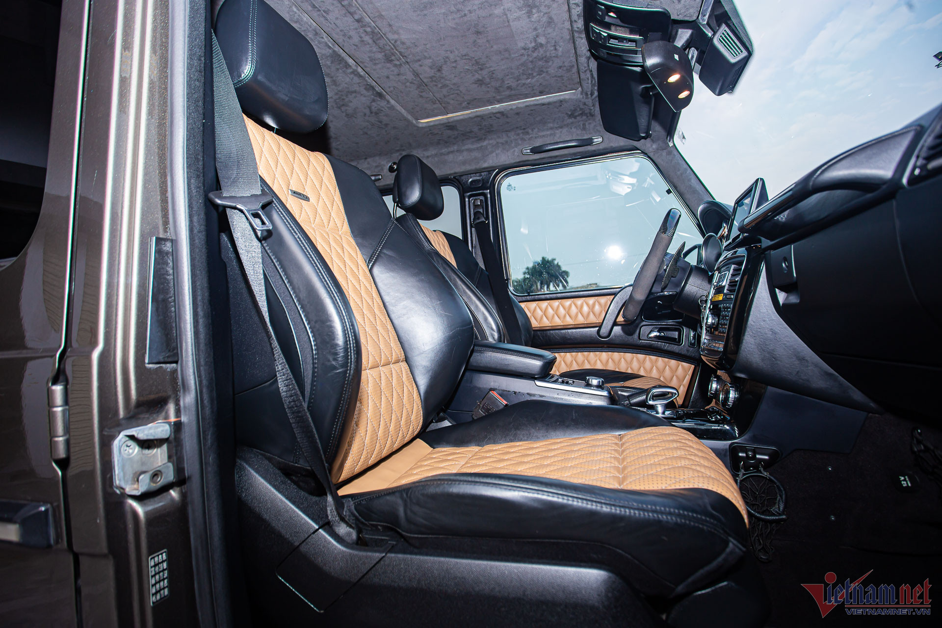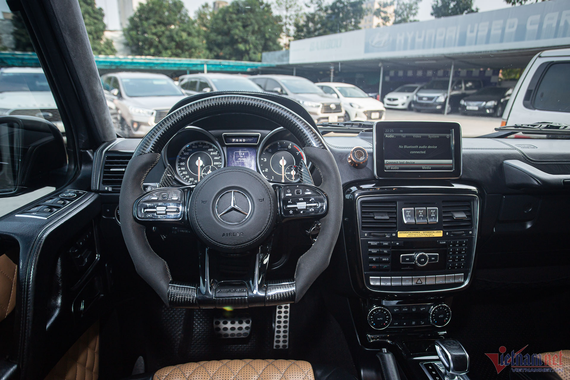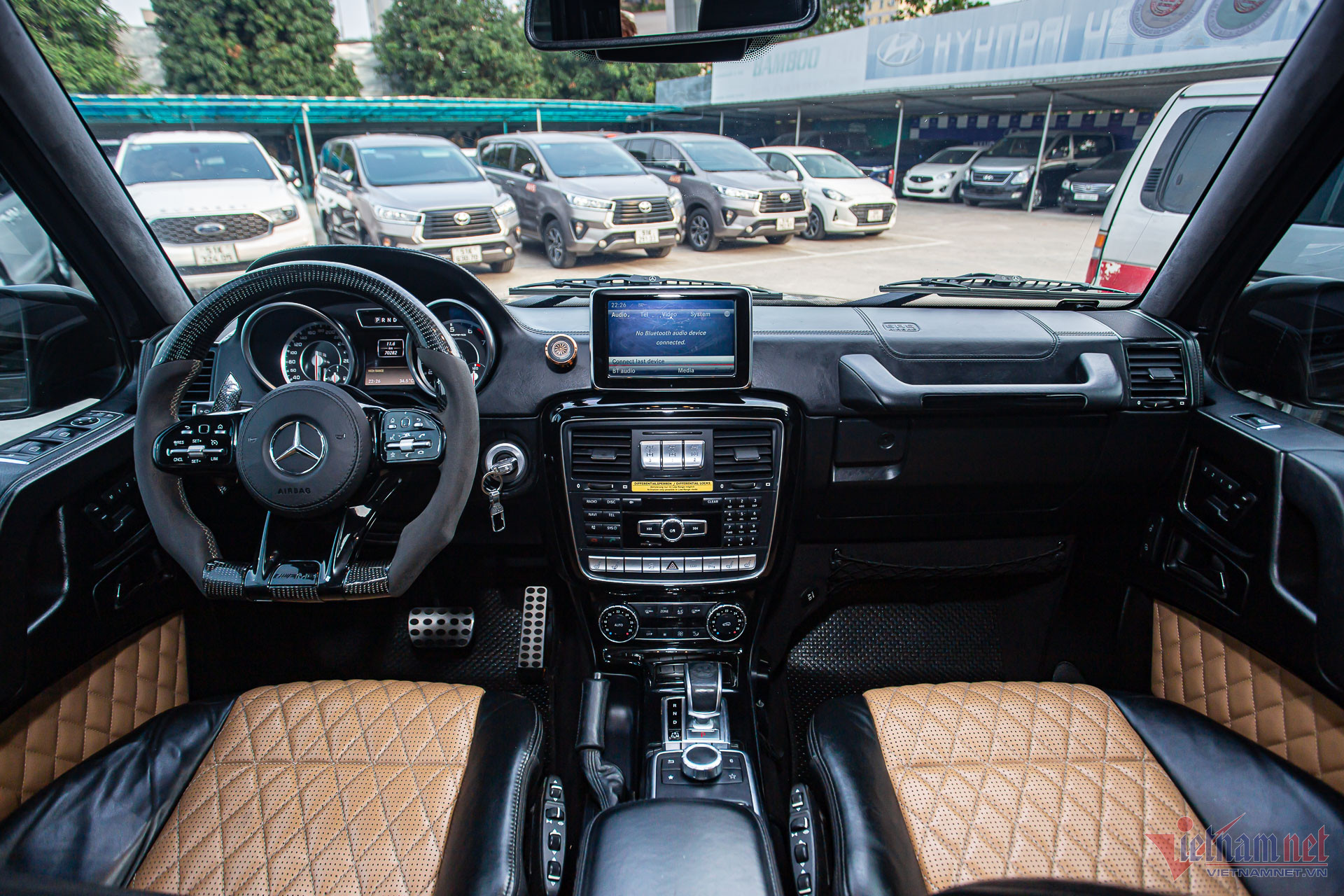 Khoang nội thất xe bọc da hai tông màu, trong đó màu đen chiếm chủ đạo. Chất liệu carbon không có trên chiếc G 63 AMG này, vì vậy chủ xe đã nâng cấp thêm vô-lăng AMG bọc da lộn và ốp sợi carbon. Sau 70.000 km lăn bánh, nhìn chung các chi tiết bằng nhựa đều đã có dấu hiệu “lão hóa”.