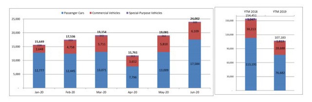Trong số 24.002 xe bán ra thị trường, có 17.584 xe du lịch, 6.109 xe thương mại và 309 xe chuyên dụng. So với tháng 5/2020, doanh số xe du lịch tăng 35%, xe thương mại tăng 5%, xe chuyên dụng tăng 18%. Xét về nguồn gốc, sản lượng xe lắp ráp đạt 15.874 xe, tăng 43% so với tháng trước và số xe nhập khẩu nguyên chiếc là 8.155 xe, tăng 21% so với tháng trước.