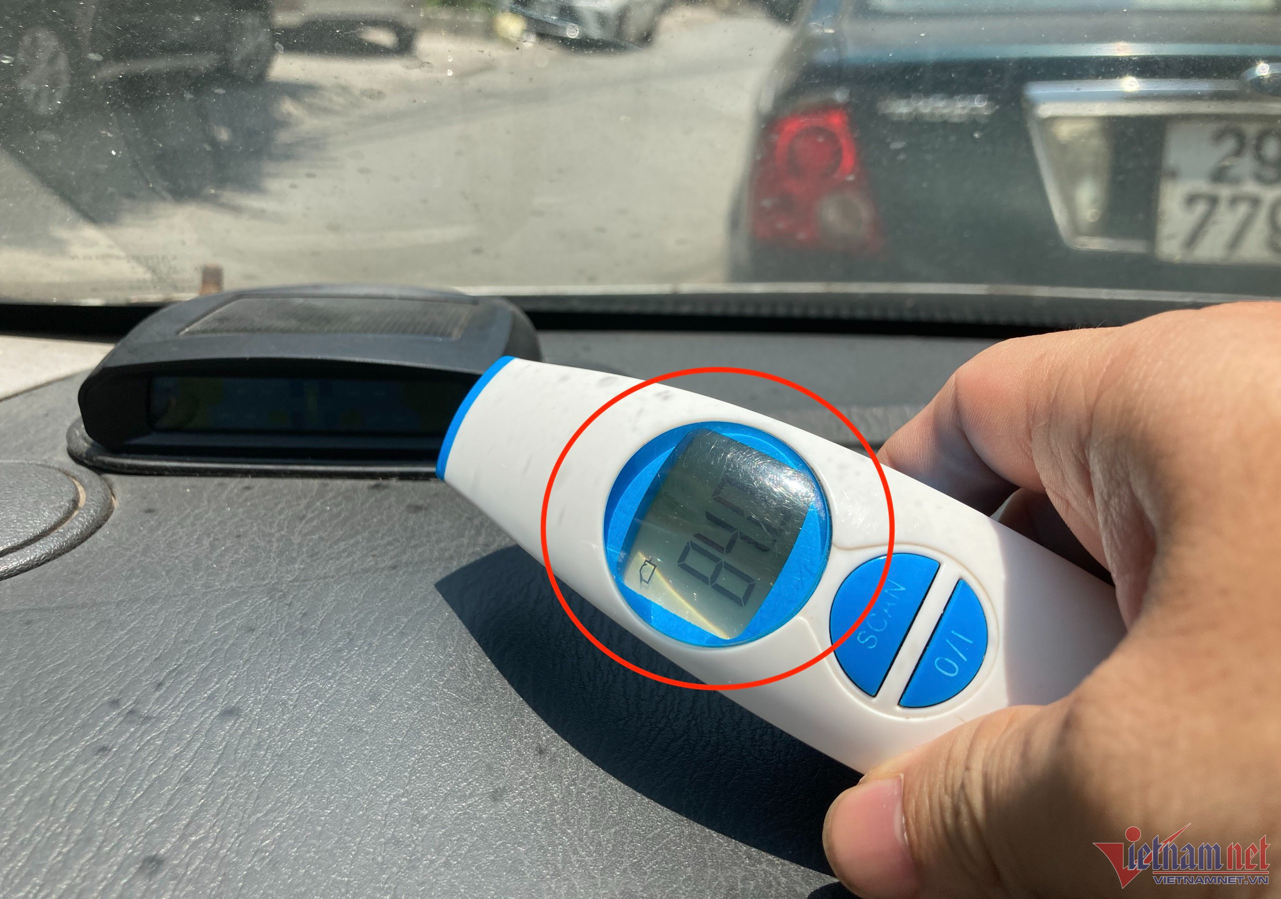 Không chỉ dễ dàng cảm nhận sự chênh lệch nhiệt độ ngoài trời và bên trong ô tô bằng cảm giác oi bức, thông qua thiết bị đo nhiệt độ cầm tay, phóng viên VietNamNet đo được nhiệt độ trong xe là 55,7 độ C, chênh lệch với ngoài trời hơn 17 độ C.