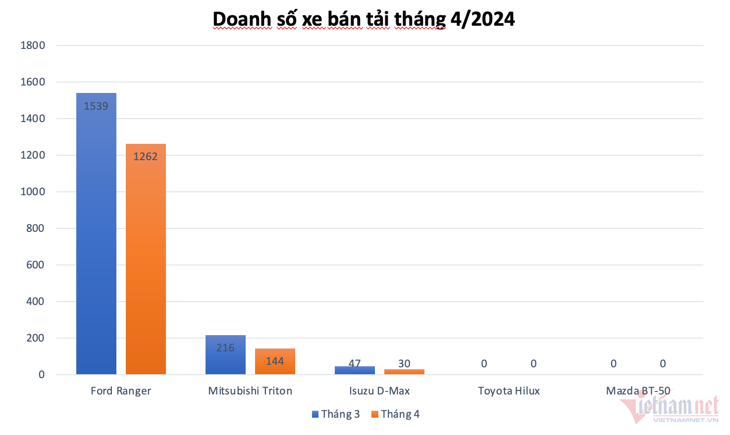 Mặc dù vậy nhưng Ford Ranger vẫn là mẫu xe có thị phần lớn nhất, doanh số đạt 1.262 xe, chiếm 87,8% tổng doanh số xe bán tải được bán ra trong tháng 4. Bốn mẫu xe có doanh số thấp đều đến từ Nhật Bản, trong đó Mitsubishi Triton có doanh số giảm 33,3% so với tháng trước, Isuzu D-Max chỉ bán được 30 xe, Mazda BT-50 và Toyota Hilux không bán được xe nào trong tháng.