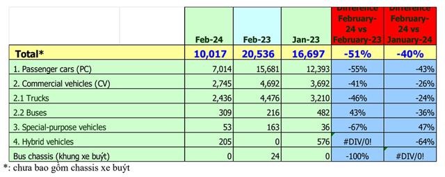 Theo báo cáo của Hiệp hội Các nhà Sản xuất Ô tô Việt Nam (VAMA), trong tháng 2/2024, doanh số bán hàng của các doanh nghiệp thành viên chỉ đạt 11.633 xe các loại, giảm 40% so với tháng 01/2024 và giảm 50% so với cùng kỳ năm 2023.