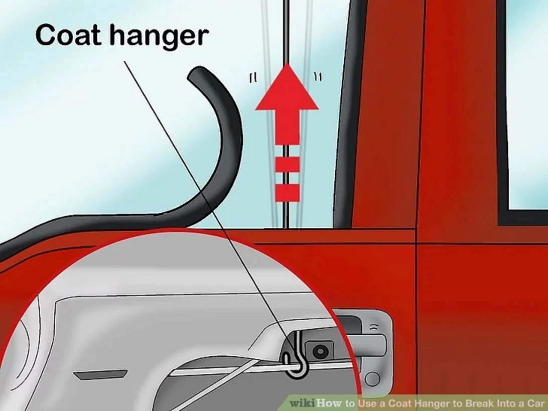 Cách thức này cũng được nhiều người sử dụng khi rơi vào tình huống kể trên. Đầu tiên bạn lấy một thanh sắt dài được uốn dạng lưỡi câu hoặc một chiếc móc treo quần áo, sau đó bẻ cong chúng và luồn vào bên trong cửa xe. Cuối cùng bạn cần từ từ kéo chốt lên và cửa xe sẽ được mở ra. Tuy vậy cách này đòi hỏi bạn phải thật kiên nhẫn bởi hầu hết mọi người đều không thành công trong những lần thử đầu tiên.