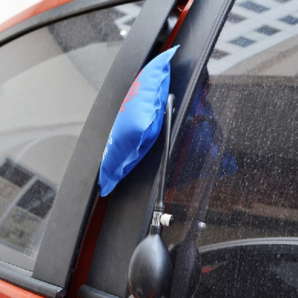 Đây là cách mở khóa xe tương đối an toàn, đơn giản nhưng mang lại hiệu quả cao. Bạn chỉ cần tạo ra một khoảng hở nhỏ giữa phần cửa xe và khung xe, sau đó nhét túi nệm khí vào và bóp bóng cao su để bơm khí vào bên trong nệm. Bằng cách này lực đẩy được tích tụ bên trong nệm khí sẽ giúp cửa xe hở ra. Tiếp đến bạn cần luồn 1 thanh sắt dài để luồn vào bên trong xe để ấn nút mở chốt cửa.